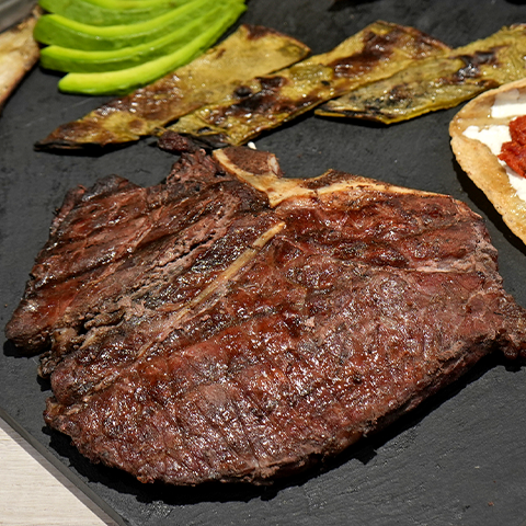 Dos cortes en uno. New York de un lado, filete del otro, unidos por el icónico hueso en forma de T. Equilibrado, jugoso y poderoso. Perfecto para los que no quieren elegir, ¡lo quieren todo!